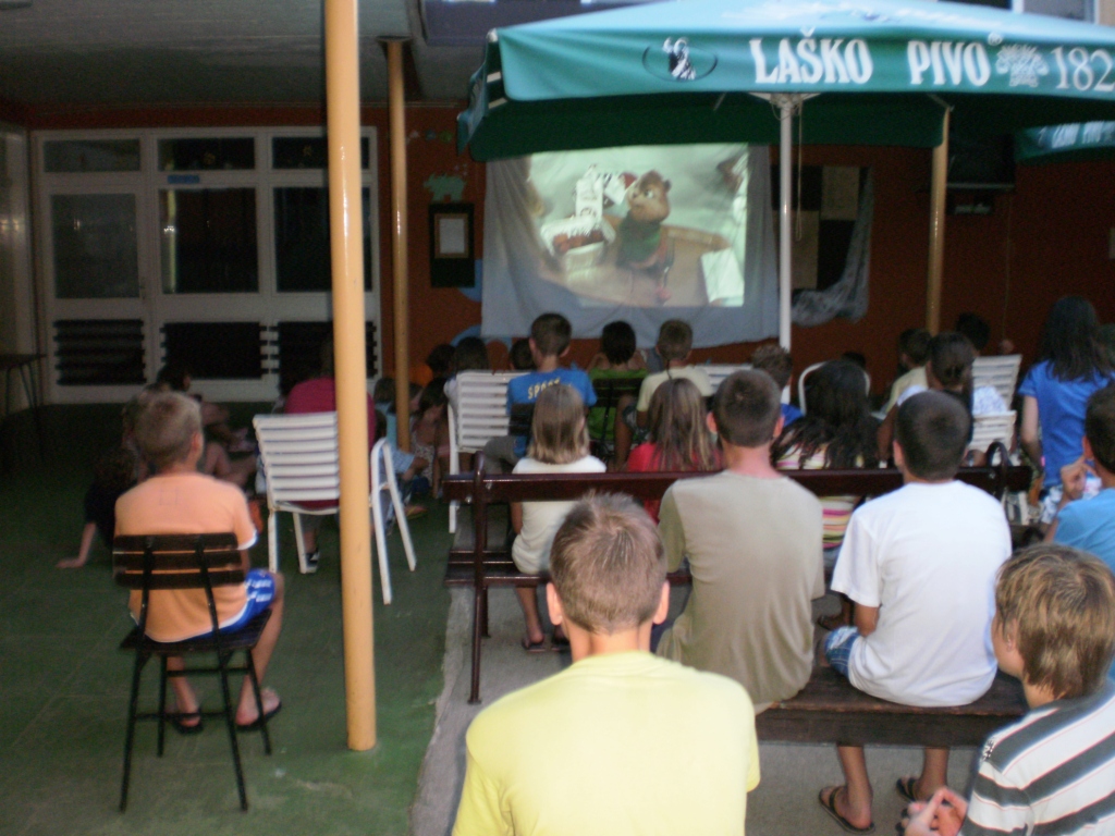 Zvečer pa sta sledili dve večerni animaciji zmenkarije in kino. Predvsem mlajši otroci so se raje udeležili kina kjer so gledali Alvina in veveričke 2, med tem ko pa so se malo starješi z velikim veseljem udeležili zmenkarij. Na obeh večernih animacijah je bilo zelo zabavno in veselo.