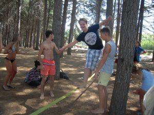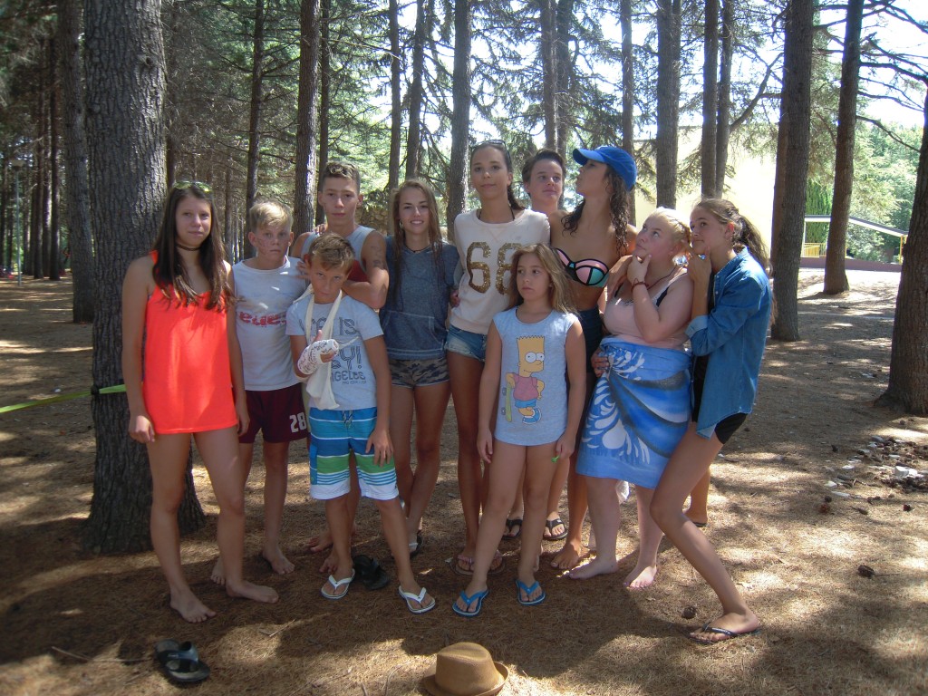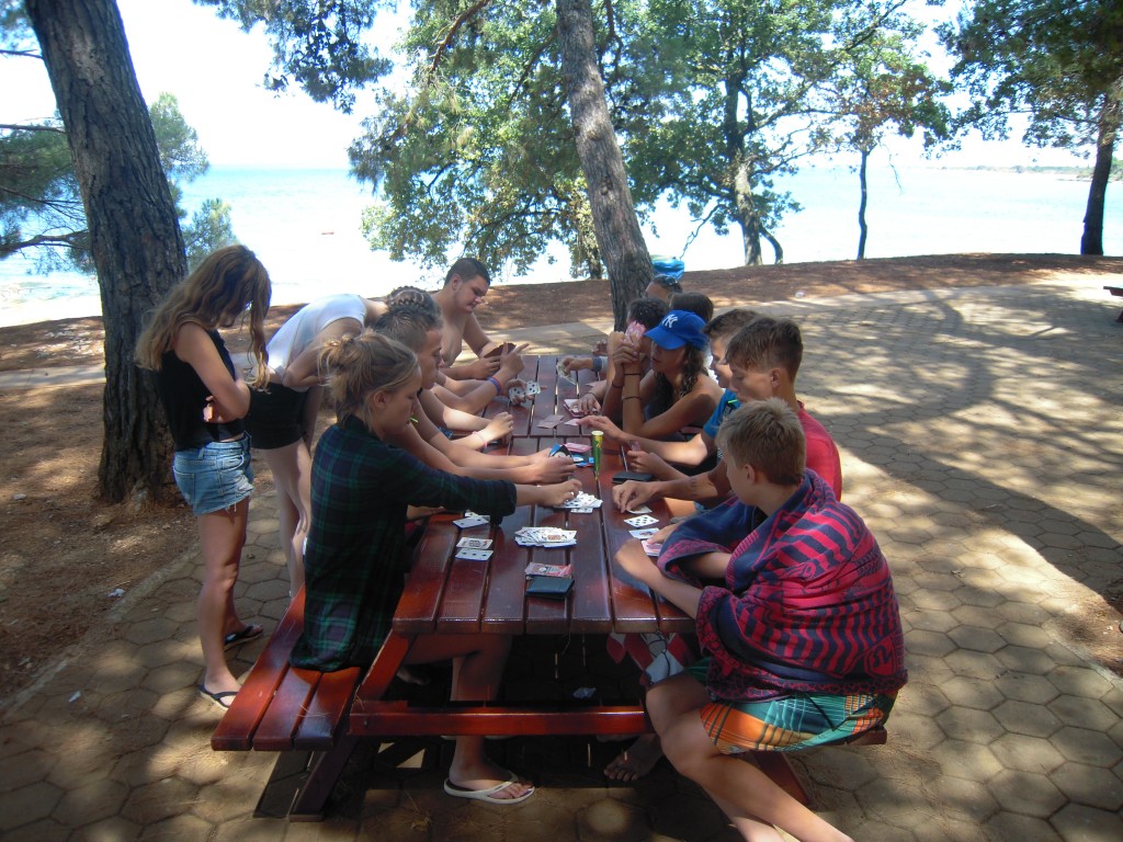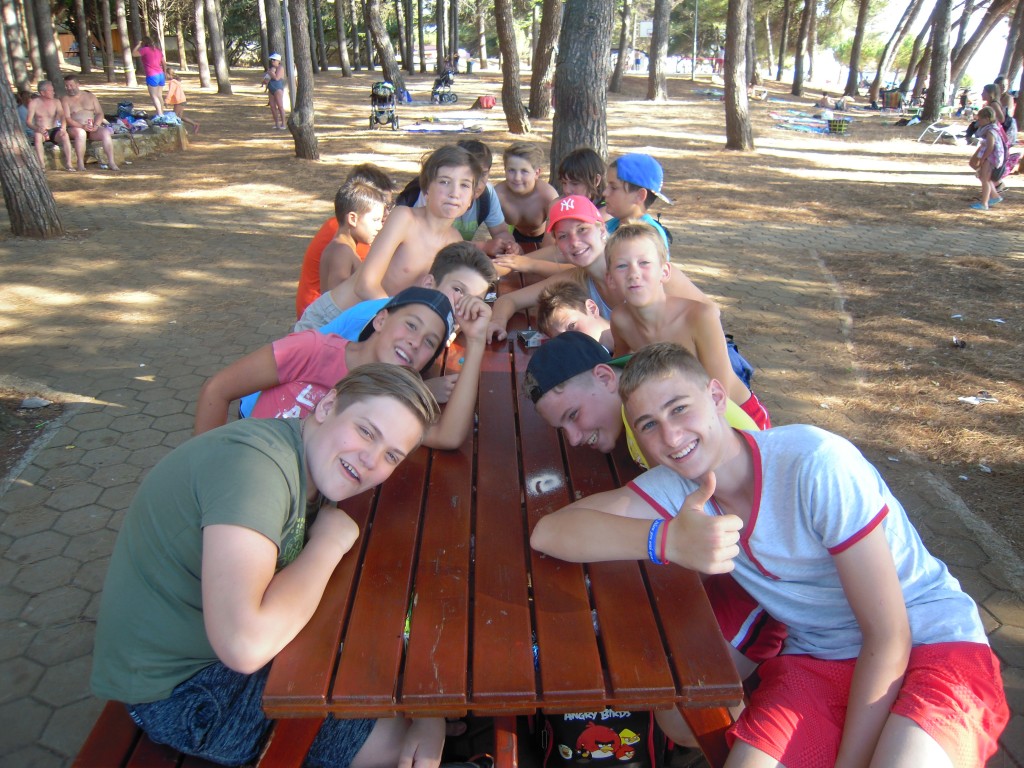 Nedelja, že naš 4. dan. Skoraj smo že na polovici. Vreme tukaj prekrasno, toplo, malo pihlja. Idealno za naše počitnice. Včeraj je bil enkraten dan. Dopoldne smo se kopali, plavali in kartali. Popoldne smo izdelovali pletene zapestnice. Naši neplavalci vsak dan pridno obiskujejo plavalni tečaj. Zvečer smo priredili filmski večer. Imamo se fino, vsi smo zdravi in veseli.